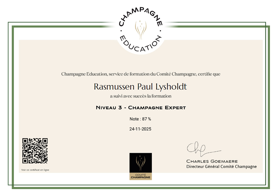 Jeg har gennem mange år interesseret mig meget for vin. Jeg havde besluttet at jeg – når jeg fik mulighed for det – ville i gang med sommelieruddannelsen, hos Vinakademiet. I marts 2024 startede jeg på uddannelsen og i februar 2025 bestod jeg den afsluttende eksamen. I forlængelse heraf fik jeg mulighed for at bestå den internationalt anerkendte WSET Level 3 Award in Wines i april 2025. Jeg er netop gået i gang med French Wine Scholar®.