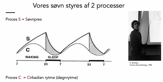 Vi ved formentlig alle, hvor vigtigt det er med en god, regelmæssig søvn. Ali Amidi, lektor i neurovidenskabelig psykologi ved Aarhus Universitet, fortalte veloplagt, vidende og med masser af humor om dette spændende emne. Om de to grundlæggende processer som styrer søvnen: Søvnpres og Døgnrytme (se tegning ovenfor). Om de to typer af søvn: REM-søvn og ikke-REM søvn, hvor sidstnævnte underopdeles i 4 stadier. Om fordelingen af søvnstadier i løbet af natten (hypnogram). Og om søvn og aldring.