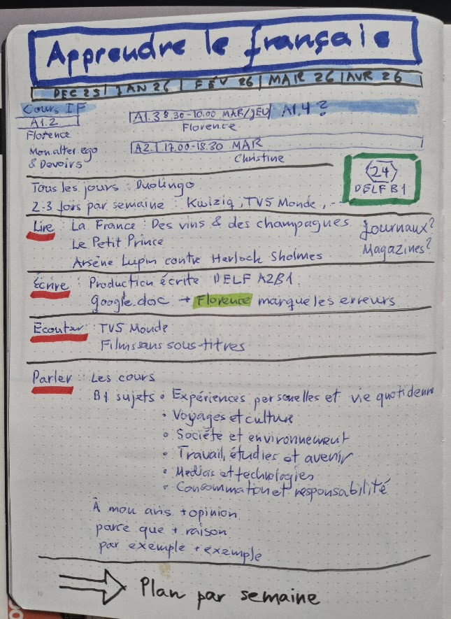 Fransk klør jeg på med. Ud over de to ugentlige træninger på A1-niveau, begynder jeg til januar også på en ugentlig træning på A2-niveau, og jeg stræber efter at gå til eksamen i B1til april, dvs. springe A2 over. Jeg har talt med min lærer Florence om det, og hun bakker op og hjælper. Jeg har naturligvis planlagt det: