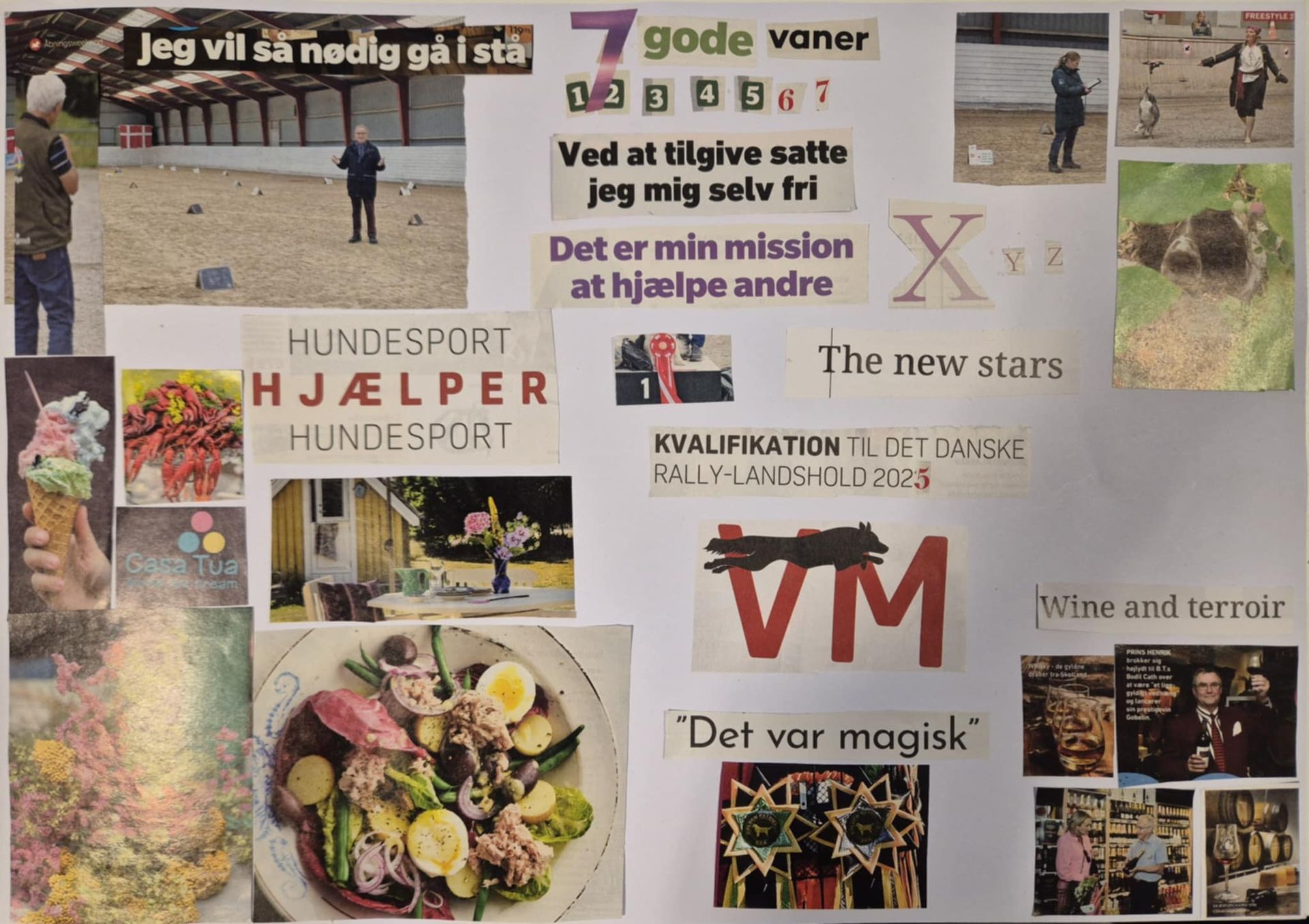 Mit Vision Board for 2025 ses ovenfor. Jeg kan tydeligt huske processen da det blev til og jeg kigger tit på det. Hvor afspejler det på mange områder hvad der er sket i år: Jeg er bestemt ikke gået i stå! Jeg har indarbejdet 7 gode vaner, er godt i gang som coach og har startet firma for at få endnu mere fokus på at hjælpe andre. Jeg har rykket helt vildt på vinområdet. Kun hundefronten fik ikke det fokus jeg troede for snart et år siden, til gengæld er kommet meget andet til, jeg slet ikke havde forstillet mig 😊